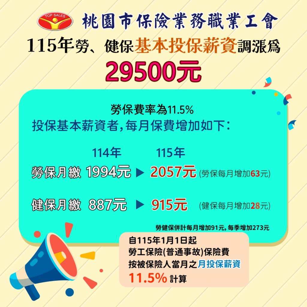 115年1月1日起, 勞、健保基本投保薪資調漲為29500元, 勞保費率維持以11.5%計收。