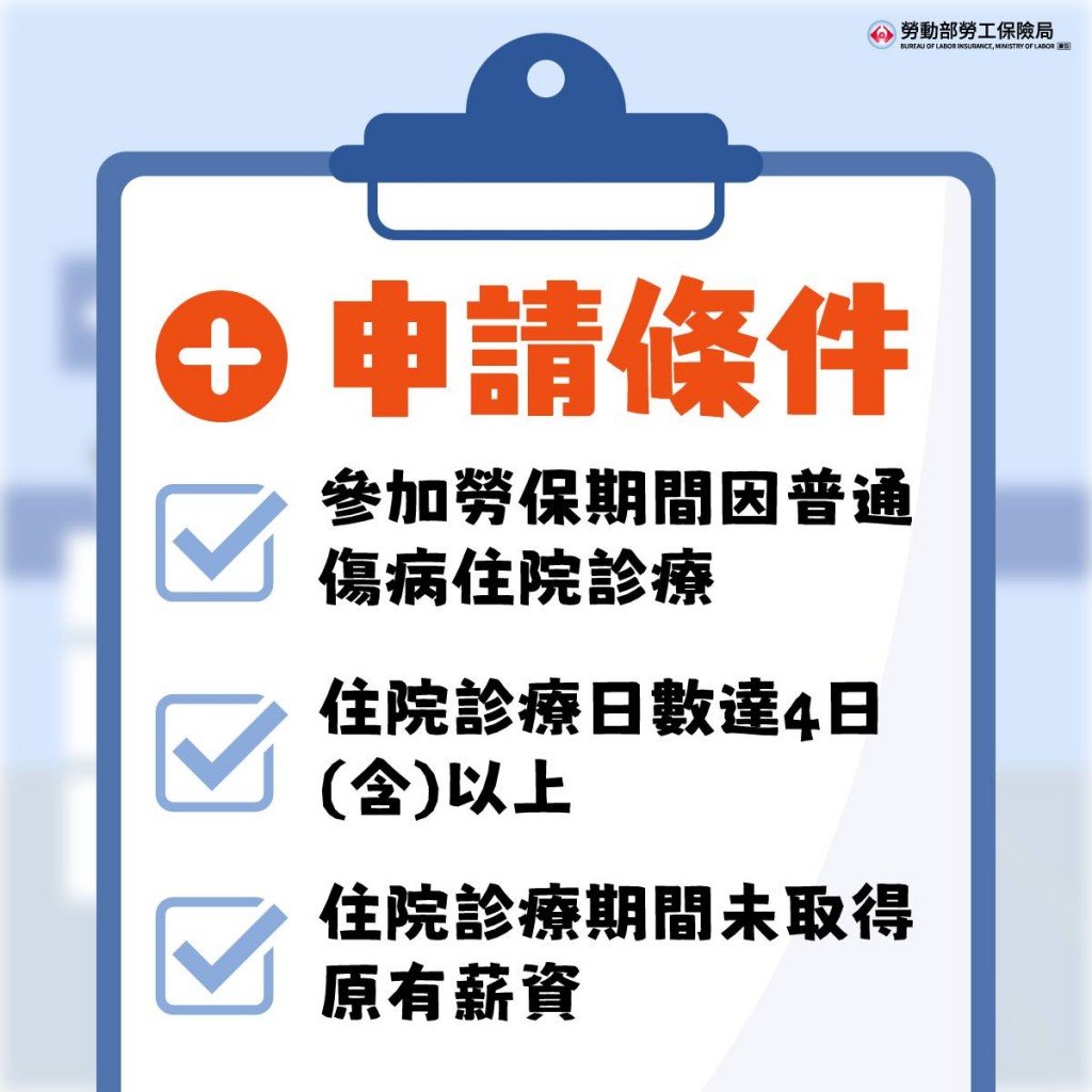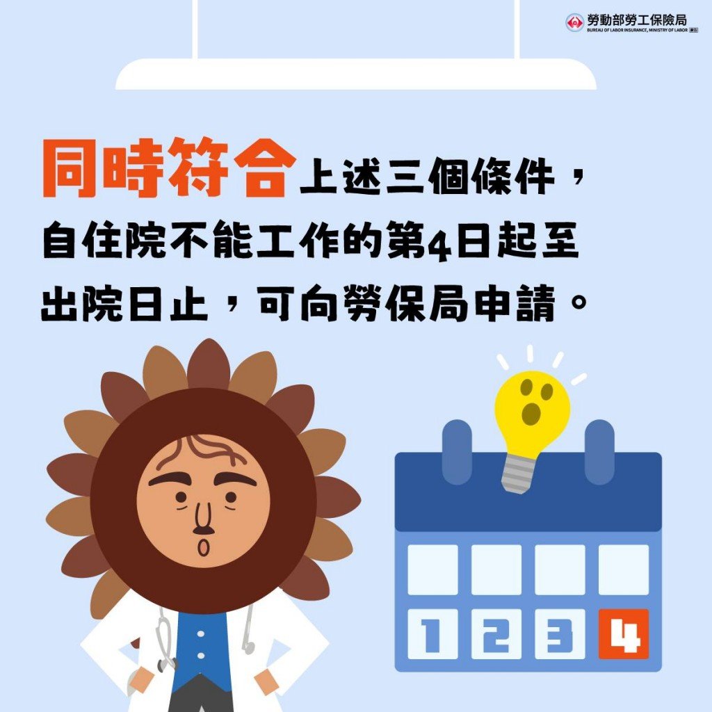 同時符合上述三個條件,自住院不能工作的第4日起至出院日止,可向勞保局申請勞保傷病給付。但門診或在家療養期間不在給付範圍喔!