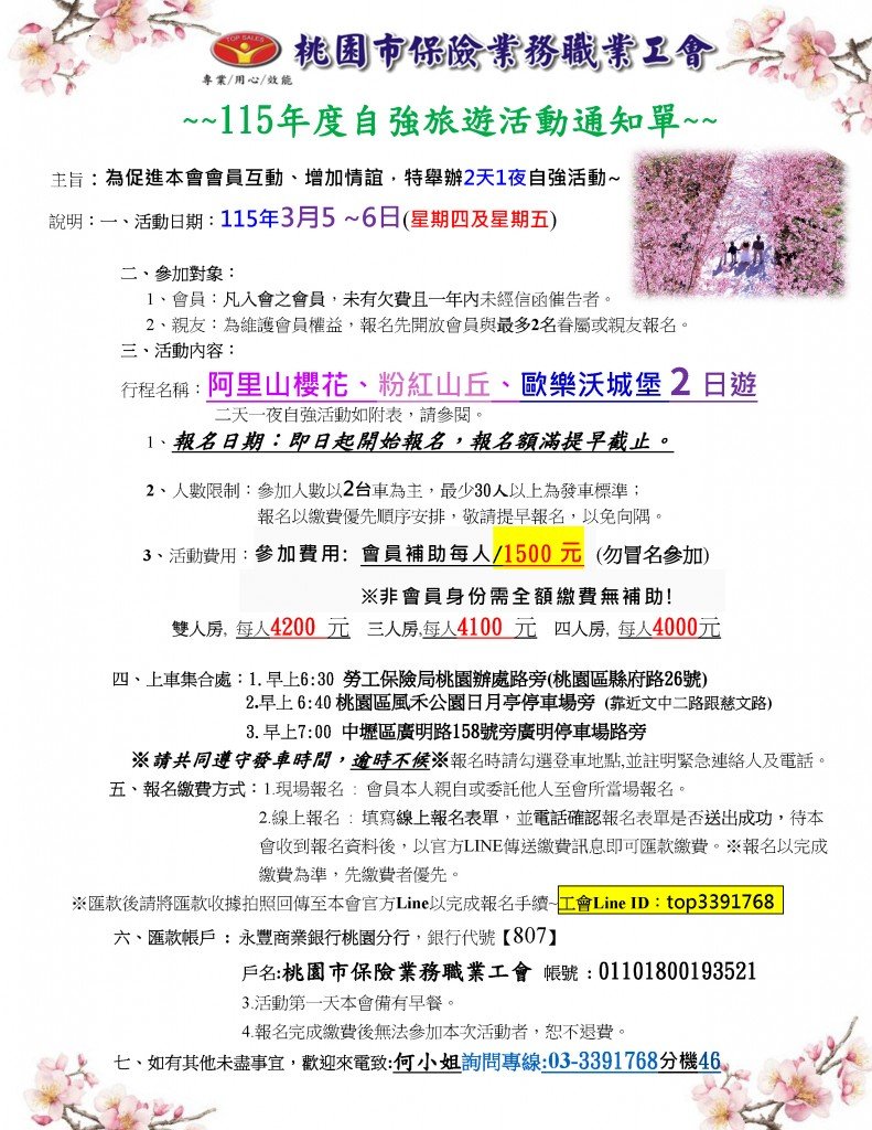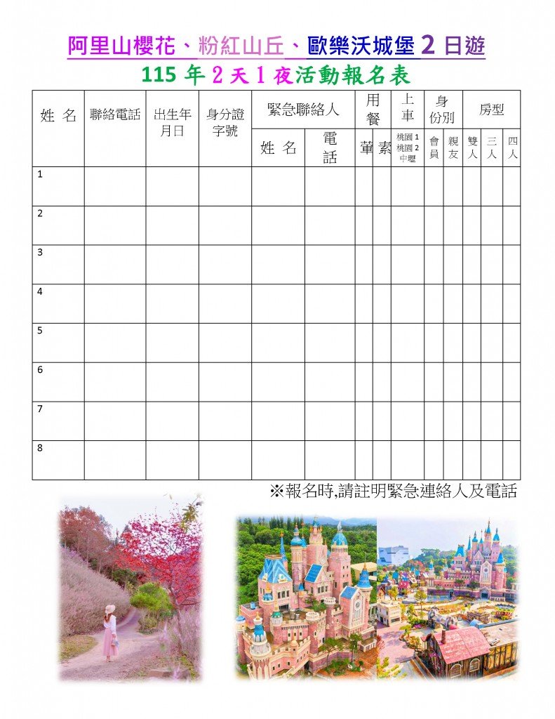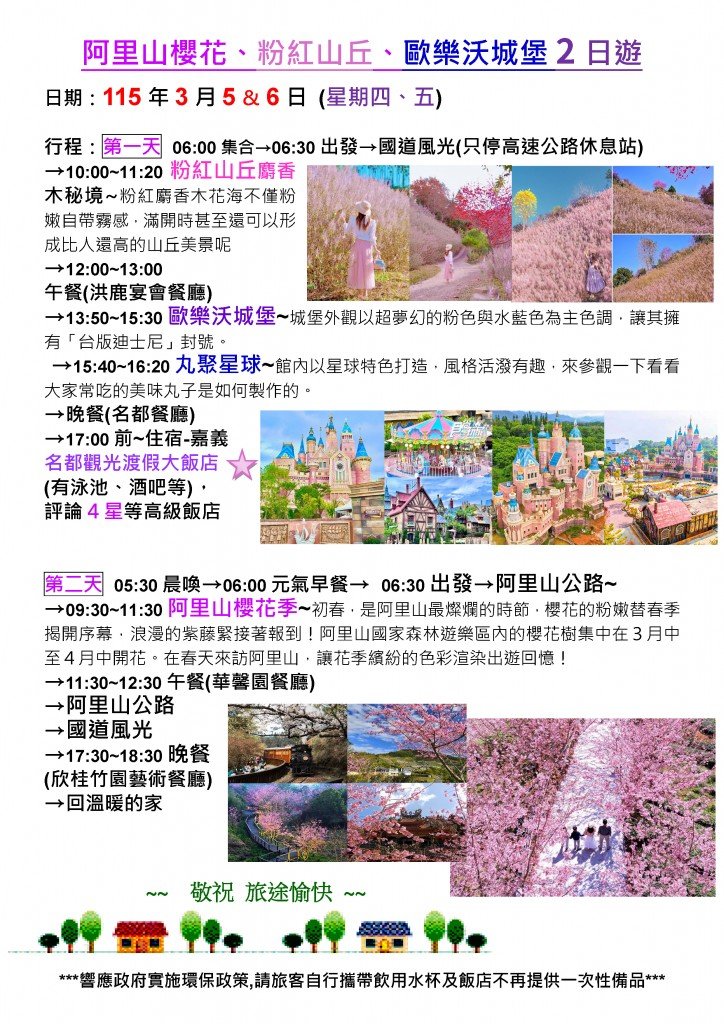 115年度自強旅遊活動-阿里山櫻花、粉紅山丘、歐樂沃城堡2日遊!!