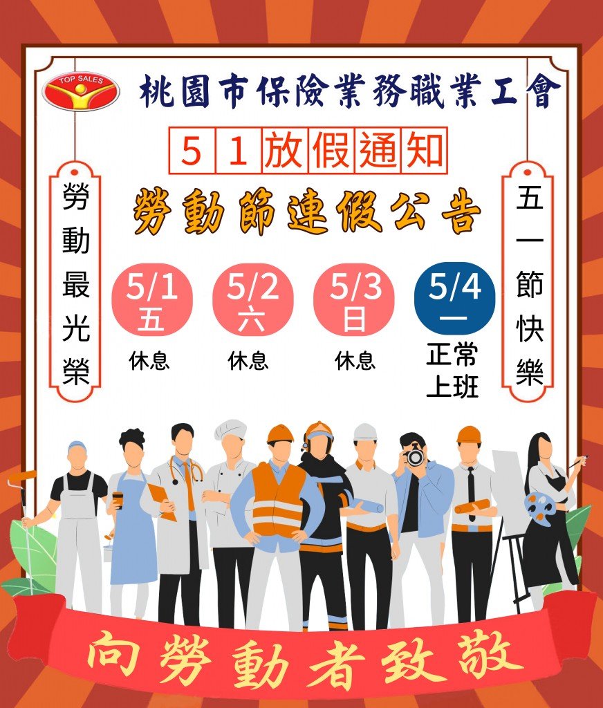 115年五一勞動節連假 5月1日〔星期五〕至5月3日〔星期日〕,工會與課程業務皆 暫停服務,並於 5月4日(星期一)正常上班。